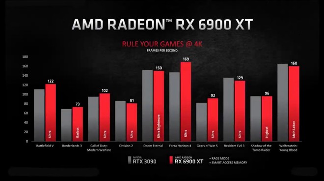 La funzionalità Rage Mode, in tandem con l’AMD Smart Access Memory, permetterà di ottenere un ulteriore aumento delle prestazioni grafiche. Secondo i dati forniti dall’azienda, questa combinazione consente a una Radeon RX 6800 XT di offrire prestazioni superiori rispetto a quelle di una GeForce RTX 3080 in diversi scenari.