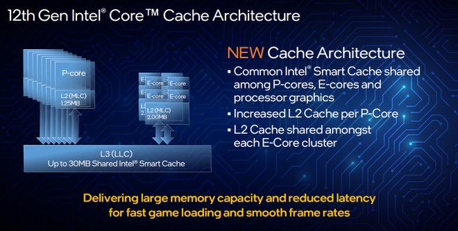Andando più nel dettaglio dell’architettura, ogni cluster di E-Core offre 2MB di cache L2 mentre la Cache L3 (Intel Smart Cache) da 30MB è condivisa con i P-Core che, invece, vantano 1,25MB di Cache L2 dedicata. A parità di frequenza, i core Golden Cove a 10nm garantiscono secondo Intel un incremento prestazionale del 16-19% rispetto al Cypress Cove dei Core 11a gen (14nm+++), mentre per Gracemont siamo sostanzialmente ai livelli di Comet Lake (Core 10a gen), il tutto però con un’efficienza nettamente migliorata. Segnaliamo inoltre che, come per i chip Core 11a gen, ritroviamo il supporto Intel Deep Learning Boost e Intel Gaussian e Neural Accelerator 3.0 (GNA 3.0).