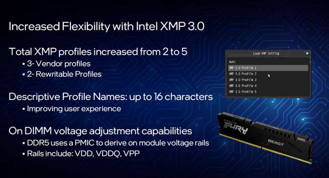 Le DDR5 introdurranno diverse novità, a partire da una nuova gestione dell’alimentazione che prevede l’integrazione del (PMIC) e moduli di regolazione della tensione (VRM) direttamente sul modulo DRAM e non più sulla scheda madre. Parliamo quindi di memorie leggermente più avanzate che, tra le altre cose, supportano l’ultima versione di Intel XMP (Xtreme Memory Profile), ossia XMP 3.0. Stando a quanto reso noto da Intel, XMP 3.0 permetterà di portare i profili XMP predifiniti su ogni modulo da due a cinque: tre sono riservati al produttore della memoria (le varie Corsair, GeIL, Kingston, G.Skill ecc), due invece saranno sovrascrivibili e a disposizione dell’utente che, in sostanza, potrà salvare direttamente sulla memoria il suo profilo preferito con tanto di nome.
