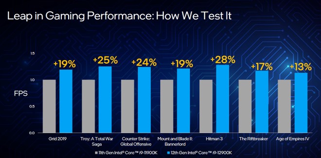 Stando sempre ai dati forniti da Intel, in gaming il nuovo Core i9-12900K da 16 core / 24 thread supera il Core i9-11900K con uno scarto che in alcuni casi può arrivare al 28% in base allo titolo; risultati simili si registrano con il top di gamma AMD, Ryzen 9 5950X che, seppur rimanendo competitivo su alcuni giochi (vedi ad esempio Shadow of The Tomb Rider e Crysis Remastered), viene battuto con uno scarto compreso tra l’8% e il 30%.